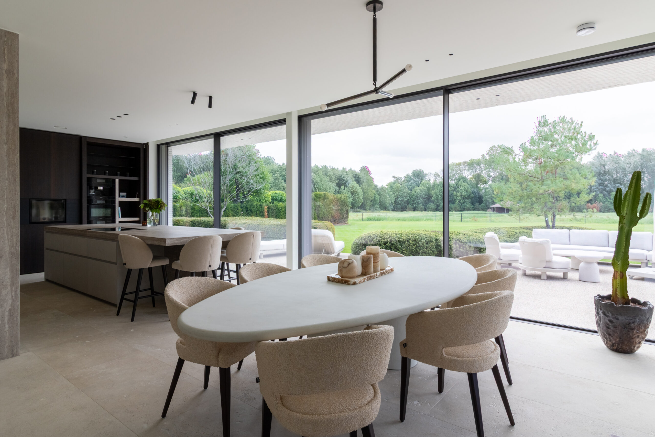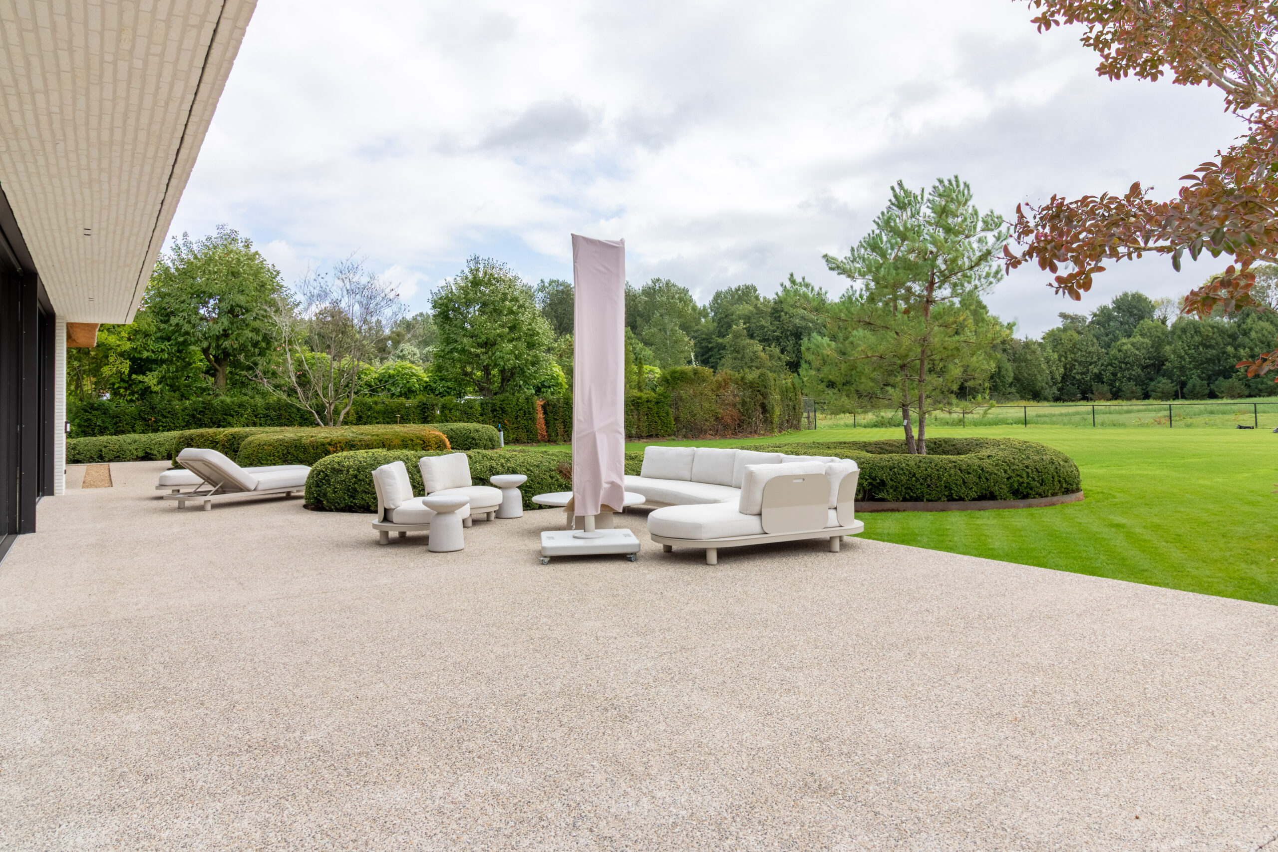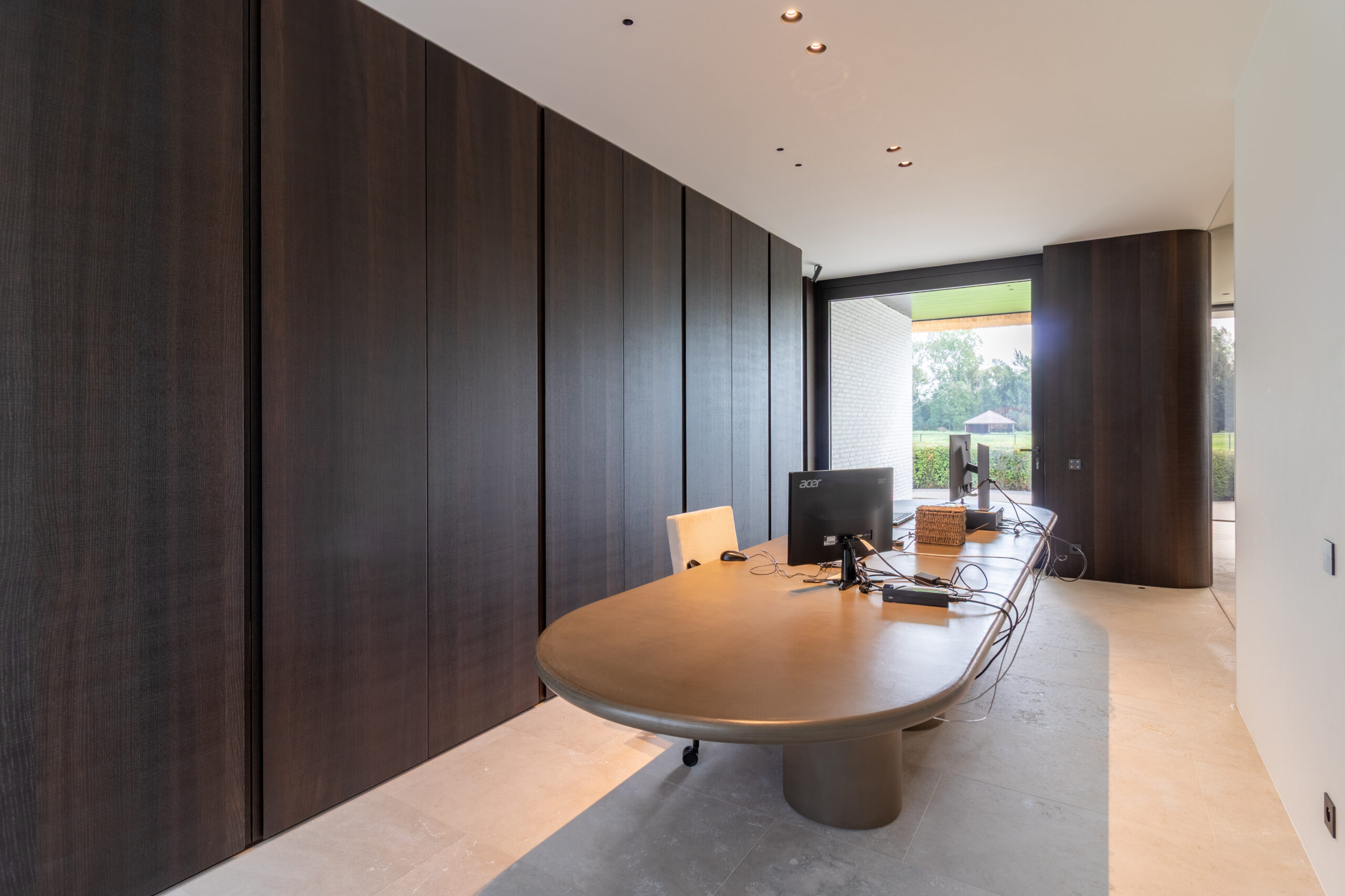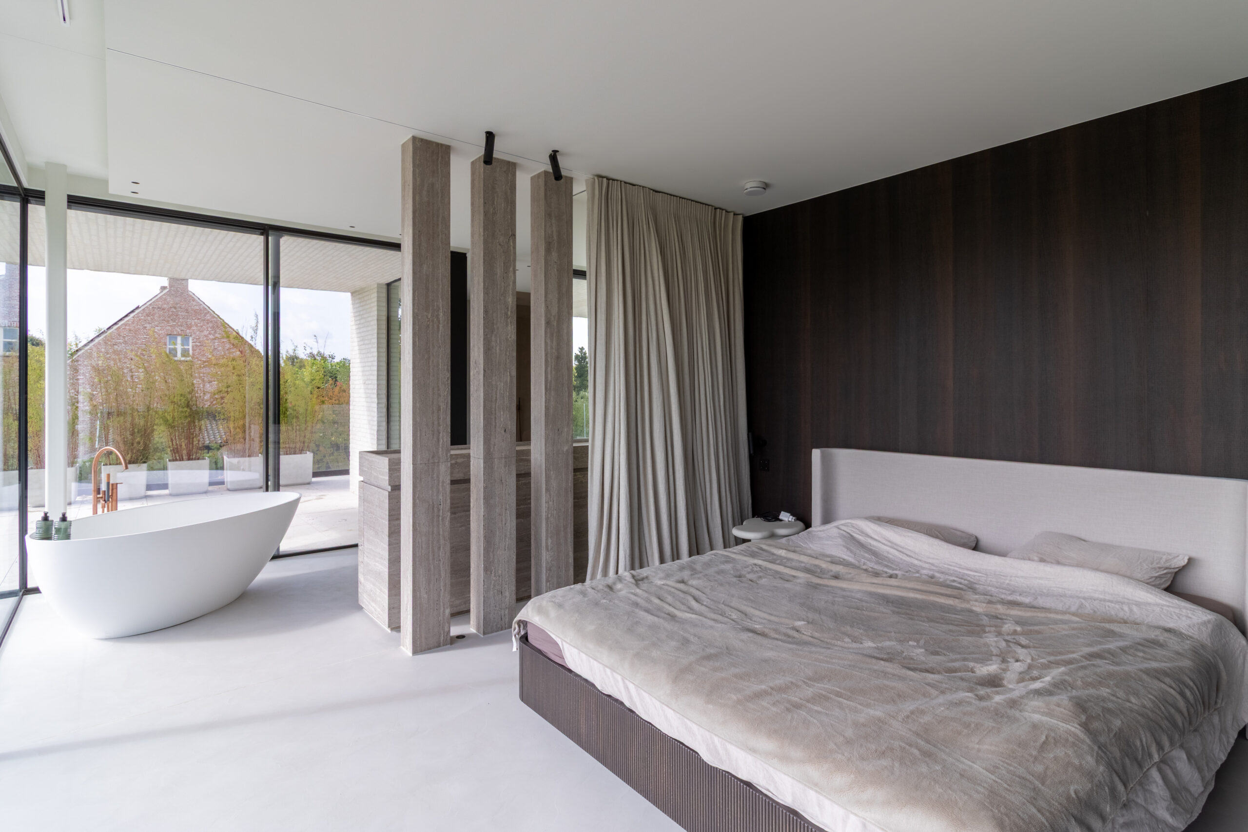 Moderne Villa Hoogstraten is een moderne parel. Het voorgaande huis is met de grond gelijk gemaakt waarna dit moderne stuk architectuur is opgebouwd. Samen met een architect is hier een villa gebouwd waar je U tegen zegt. Het huis is modern en industrieel maar voelt tegelijk warm en huiselijk. Dat komt omdat er door het gehele huis alleen is gewerkt met natuurlijke kleuren en accenten en muren zijn afgewerkt met ronde vormen. Een mooi detail is het natuursteen wat overal door het huis terug komt, in de keuken, de hal, de slaapkamer en de badkamer. Buiten beschik je over 2 hectare grond, een nieuw aangelegde tuin met daarachter een groot stuk weiland omringd door bomen. Dat maakt het toch helemaal af.